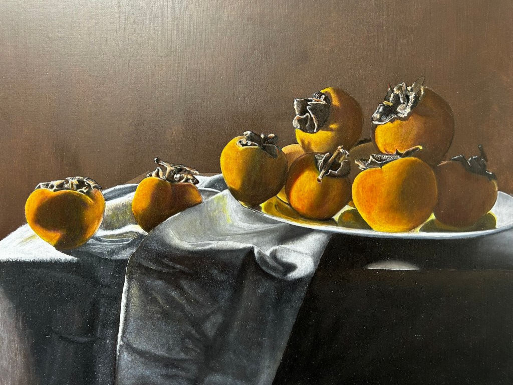 This still life with persimmons is painted after a photograph. The cloth is rendered in grisaille — the traditional grey-toned underpainting technique — while the fruits are painted in brunaille, using warm, dark earthy tones. The background is burnt umber mixed with black, on a linen canvas. The fruits were built up with multiple layers of glazing to achieve depth and luminosity — a technique beloved by the Baroque masters.